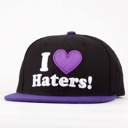 DGK Haters snapback hat. "I Heart Haters" embroidery on front. "Motivation" text embroidered on underside of bill. Contrast bill and eyelets. Adjustable snapback. Imported.